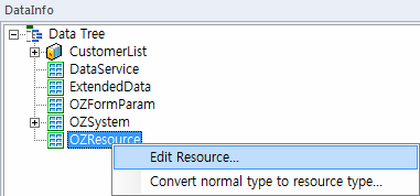 Click the [Edit Resource] pop-up menu of OZResource from the DataInfo window.