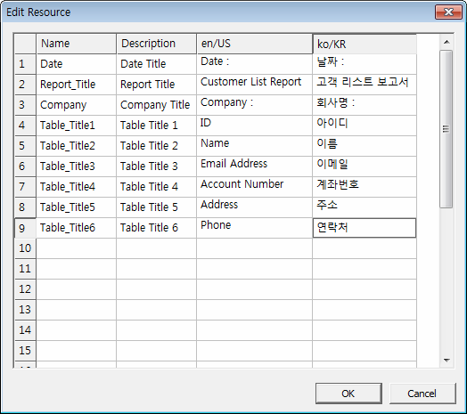 Usage of the Edit Resource dialog box: Insert/Add Language : To insert/add a resource language, click the [Insert Language]/[Add Language] pop-up menu in the language column. Delete Language : To delete a language, click the [Delete Language] pop-up menu in the language column. Change Language : To change a language, select another language from the [Change Language] pop-up menu and click [OK]. Change the order of priority : Resource language is applied in the order of priority displayed in the edit resource dialog box. If you want to change the order of priority, click the [Left]/[Right] pop-up menu in the language column. Insert/Add Field : To insert/add a resource field, click the [Insert Resource]/[Add Resource] pop-up menu in the field row. Delete Resource : To delete a resource field, click the [Delete Resource] pop-up menu in the field row. Change the order of field : To change the order of a field, click the [Move to Top]/[Move to Bottom]/[Move Up]/[Move Down] pop-up menu in the field row. |