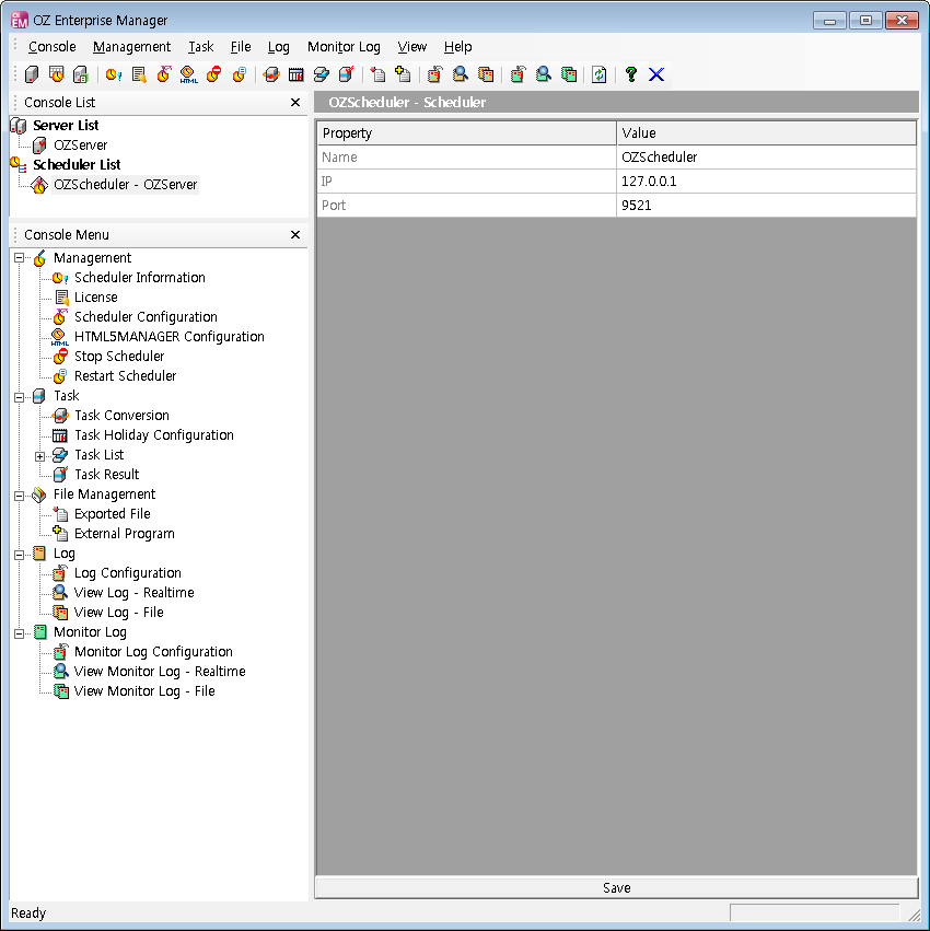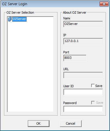 After select the server to connect enter a user ID and password with admin rights in "OZ Server Login" dialog box, When you click the [OK] button, the Scheduler, and OZ server is connected. Scheduler and OZ server connection is completed, the scheduler can manage icons and menu will be displayed in toolbar and console menu.