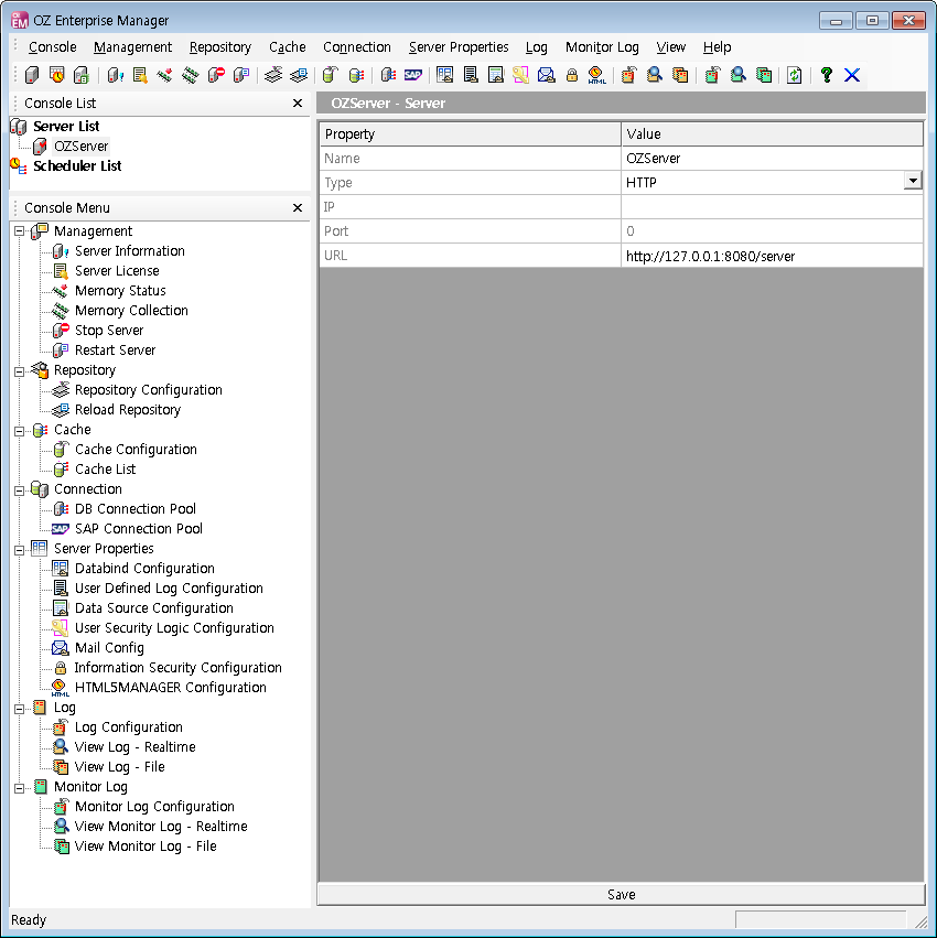 With admin privileges on the "Login" dialog box, enter the user ID and password, and then connect to the server and click the [OK] button. When the connection to the server is complete, icons and menus that can manage the server is displayed in the toolbar and console menu.