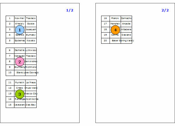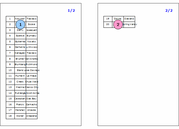 RegionにDataBandとデータラベルが追加されていてデータ件数が20件の場合、"出力方向"属性値によって次の通りにバインディングされます。