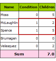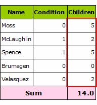 Conditionに構わず、全ての行の Childrenを計算するため、 "5 + 2 + 5 + 0 + 2"の結果14でバインディングされる |