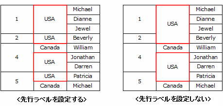 先行ラベルを設定した場合は先行ラベルの値が異なると分割し、先行ラベルを設定しない場合は必ずLabelを結合します。上図の場合、先行ラベルを設定した場合はUSAを表示するグループラベルが結合され、先行ラベルが1と2、4と5の境で分割されますが、先行ラベルを設定しない場合は必ず結合されます。