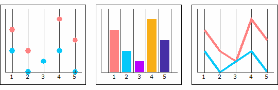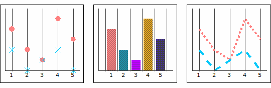 パターンの表示属性値を"はい"に設定した場合、チャート ウィザードの[データ マーカーのパターン]、[塗りつぶしのパターン]、[線のパターン]タブで設定したパターンでデータ マーカー、塗りつぶし、線のパターンが決定されます。