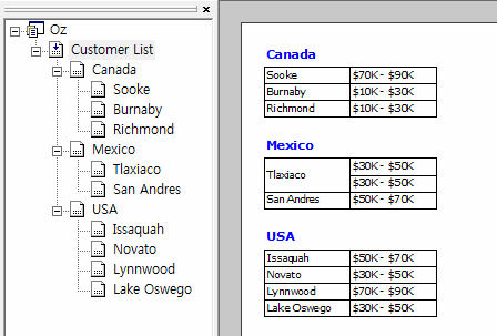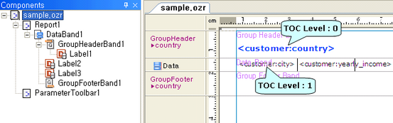 次の通りにデザインされたレポートでLabel1の目次のレベル属性値を0に、Label2の目次のレベル属性値を1に設定した場合