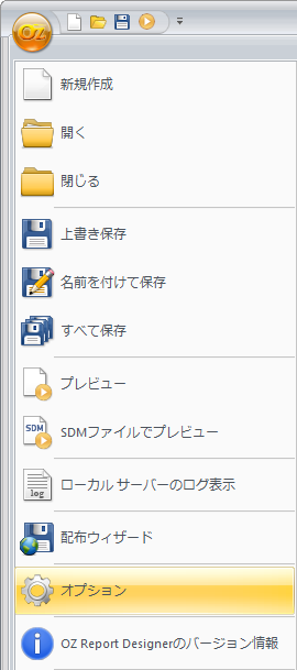 Designerの環境設定は、Designer左側上段のOZアイコンをクリックして[オプション]メニューをクリックすると表示される"オプション"ダイアログを利用してください。