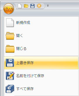 Designer左側上段のOZアイコンをクリックして[上書き保存]メニューをクリックします。