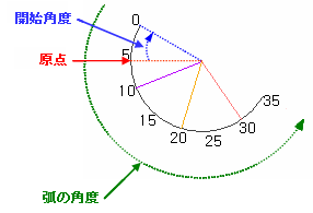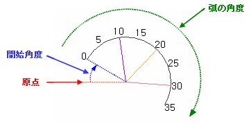 次の例の場合、開始角度は30、弧の角度が180に設定しました。