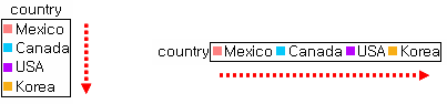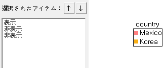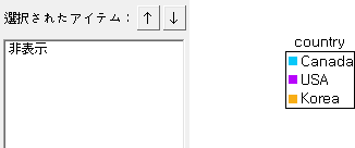凡例ラベルに表示される値が"Mexico、Canada、USA、Korea"順の場合、"表示指定"ダイアログで設定した項目順によって各項目別に凡例ラベルの表示/非表示が決定されます。