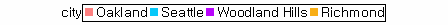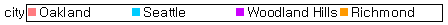 凡例に表示されるデータ値が"Oakland、Seattle、Woodland Hills、Richmond"の場合、"凡例ラベルの幅を最大幅に合わせ"オプションによって凡例ラベルの幅が異なって適用されます。