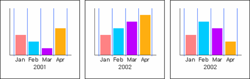 系列に構わず、すべてのX軸ラベルを同一に構成します。つまり、Yearが2001の時、AprのデータがなくてもX軸ラベルにAprが表示され、2002の時、Feb、MarのデータがなくてもX軸ラベルにFeb、Marが表示されます。