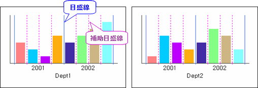 Monthフィールド値を補助目盛線で、Yearフィールド値を目盛線で表示し、Deptフィールド値によってChartを分離して表示します。