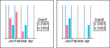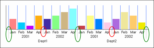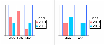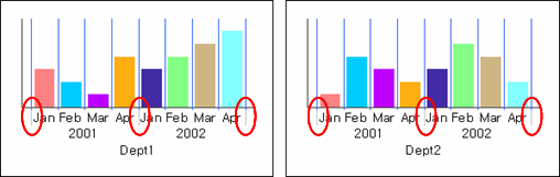 それぞれの系列に該当するX軸フィールド値でのみX軸ラベルを構成します。つまり、DeptがDept1の時にAprのデータがないため、X軸ラベルにAprは表示されず、Deptが2002の時にFeb、Marのデータがないため、X軸ラベルにFeb、Marは表示されません。