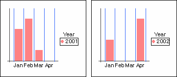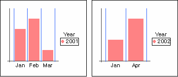 それぞれの系列に該当するX軸フィールド値でのみX軸ラベルを構成します。つまり、Yearが2001の時にAprのデータがないため、X軸ラベルにAprは表示されず、Yearが2002の時にFeb、Marのデータがないため、X軸ラベルにFeb、Marは表示されません。